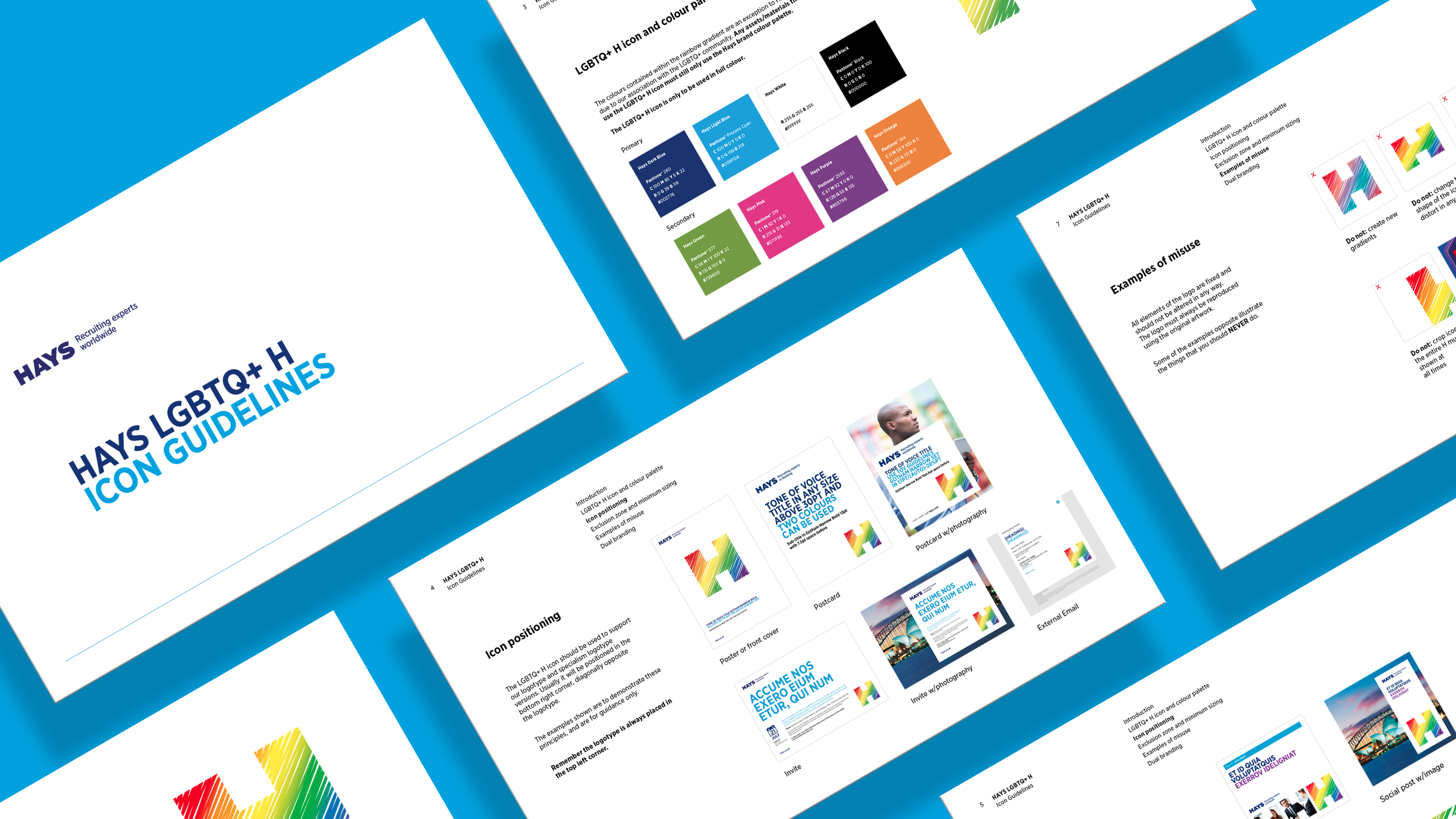 We were asked to create a new identifier to support their global initiative to create an internal Hays pride network. It needed to sit in line with their other H symbols but be obviously representative of the LBGQT network - with only 8 ‘H’ symbols in existence, Hays deemed the project to be of high importance. Leaning towards the pride rainbow was the obvious choice, but using a scribble style gave it a sense of freedom whilst retaining obvious recognition. The guide provided clear rules for usage and demonstrated the look across multiple touchpoints.